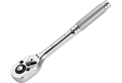 Цельнометаллический хромированный ключ-трещотка Сибртех 14014 из стали CrV, с посадочным размером 1/4″ и 45-зубым храповым механизмом, с функцией быстрого сброса, используется для монтажа и демонтажа резьбовых соединений. Предназначен для установки торцевых головок, адаптеров и удлинителей. Цельнометаллическая конструкция отличается повышенной прочностью, что позволяет работать со значительным усилием. Инструмент пригодится дома, в гараже и в поездке. Преимущества Прочность — ключ изготовлен из закаленной хромованадиевой стали и выдерживает высокие нагрузки. Долговечность — хромированная поверхность устойчива к образованию коррозии. Функция реверса — при помощи переключателя с металлическим флажком можно одним движением изменить направление вращения трещотки. Надежная фиксация — шариковый замок крепко удерживает торцевую головку, поэтому она не соскочит во время работы. Быстрый сброс — достаточно нажать на кнопку, чтобы освободить головку от насадки, это особенно удобно для работы с крепежом разного размера.