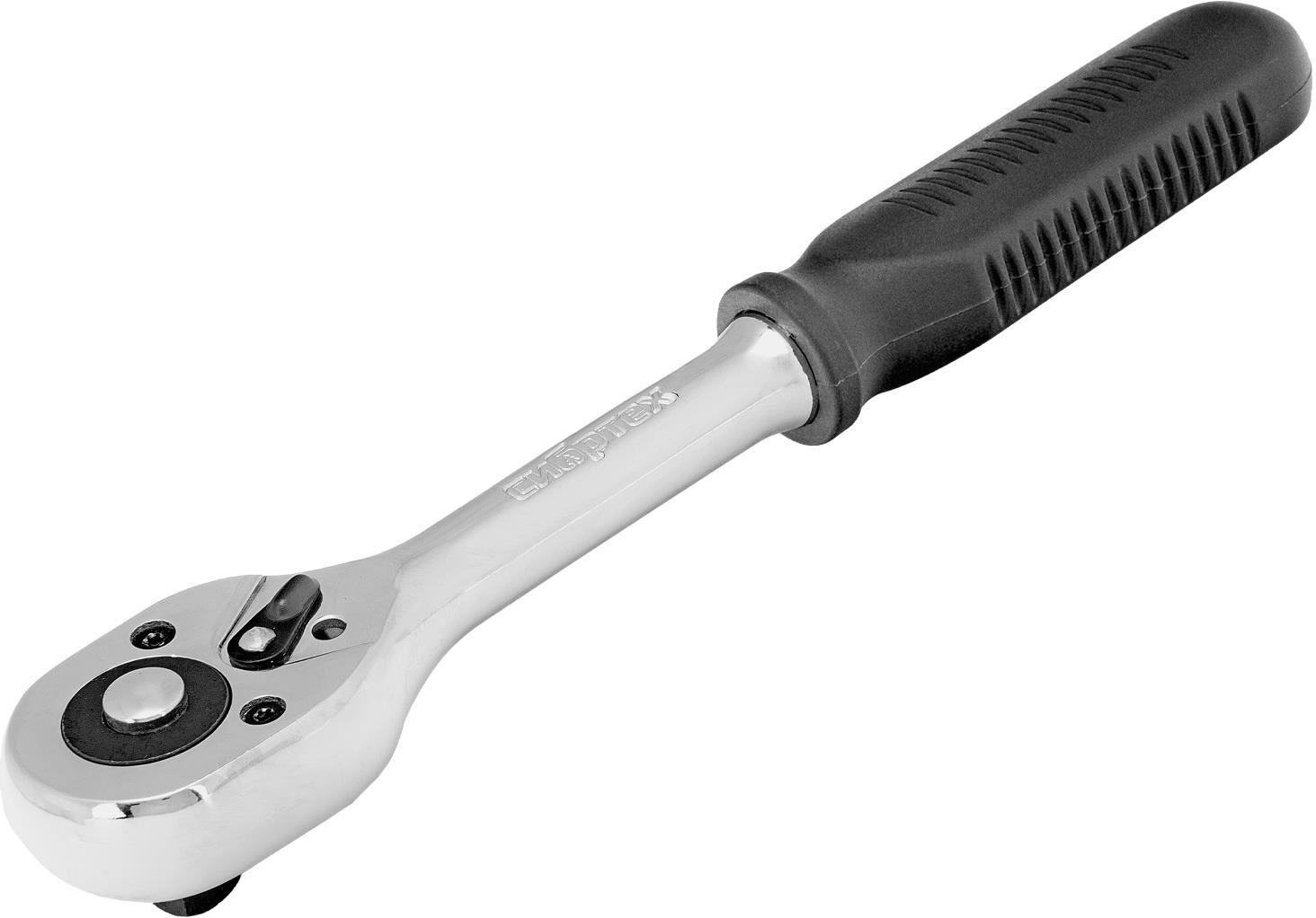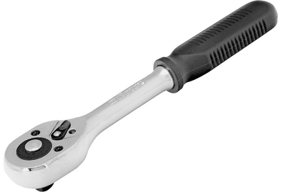 Хромированный ключ-трещотка Сибртех 14002 из стали CrV, с посадочным размером 3/8″ и 45-зубым храповым механизмом, с функцией быстрого сброса, используется для работы с резьбовым крепежом. Трещоточный механизм с 45 зубьями обеспечивает плавное вращение, облегчая работу. Инструмент пригодится дома, в мастерской и гараже. Преимущества Прочность — ключ изготовлен из закаленной хромованадиевой стали и выдерживает высокие нагрузки. Долговечность — зеркальное хромовое покрытие предотвращает образование коррозии. Эргономичность — рукоятка с нескользящей рельефной поверхностью надежно ложится в руку, поэтому работать инструментом комфортно. Функция реверса — при помощи переключателя с металлическим флажком можно одним движением изменить направление вращения трещотки. Надежная фиксация — шариковый замок крепко удерживает торцевую головку, поэтому она не соскочит во время работы. Быстрый сброс — достаточно нажать на кнопку, чтобы освободить головку от насадки, это особенно удобно для работы с крепежом разного размера.