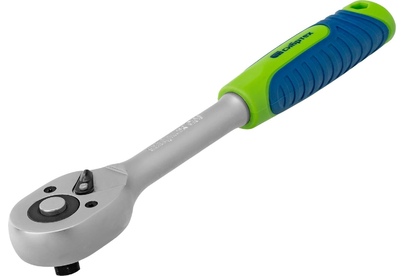 Ключ-трещотка Сибртех 14022 с присоединительным квадратом 3/8", функцией быстрого сброса и храповым механизмом с 45 зубьями, имеет покрытие «матовый хром» и используется с торцевыми головками, имеющими посадочное гнездо соответствующего размера. Предназначен для закручивания и раскручивания резьбового крепежа. Храповой механизм с 45 зубцами обеспечивает плавное вращение. Ключ применяется для ремонта автомобилей, техники и оборудования, пригодится также дома и на даче. Преимущества Прочность и долговечность — инструмент изготовлен из высококачественной закаленной стали, рабочая часть хромирована для защиты от коррозии. Быстрый переход от монтажа к демонтажу — направление вращения меняется при помощи переключателя. Простая установка и замена насадки — механизм быстрого сброса позволяет моментально снимать торцевую головку. Надежная фиксация оснастки — металлический шарик-держатель крепко удерживает торцевую головку, адаптер, удлинитель и т.д. Комфортная эксплуатация — эргономичная двухкомпонентная рукоятка удоб