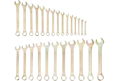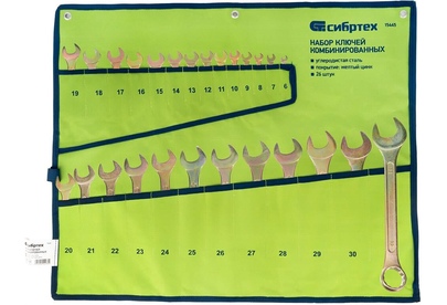 Набор комбинированных ключей Сибртех 15445 размером 6-32 мм, с покрытием «желтый цинк», включает в себя 26 инструментов для монтажа и демонтажа шестигранного резьбового крепежа соответствующего размера. Наличие рожкового и кольцевого зева делает каждый ключ универсальным в применении. Накидные головки с 12-гранным профилем надежно удерживают крепеж, уменьшая риск его деформации. Набор будет полезен в сервисном центре, авторемонтной мастерской, для выполнения монтажных работ. Пригодится также дома и на даче.ПреимуществаПрочность и устойчивость к механическим нагрузкам — ключи изготовлены из кованой углеродистой стали, прошли отжиг, закалку и последующий отпуск.Повышенная износостойкость — рабочие части закалены до твердости 45 HRC.Долговечность — желтое цинковое покрытие надежно защищает инструменты от образования коррозии.Высокая эффективность — накидные головки расположены под углом 15° к плоскости ключей, что позволяет работать с комфортом даже в труднодост