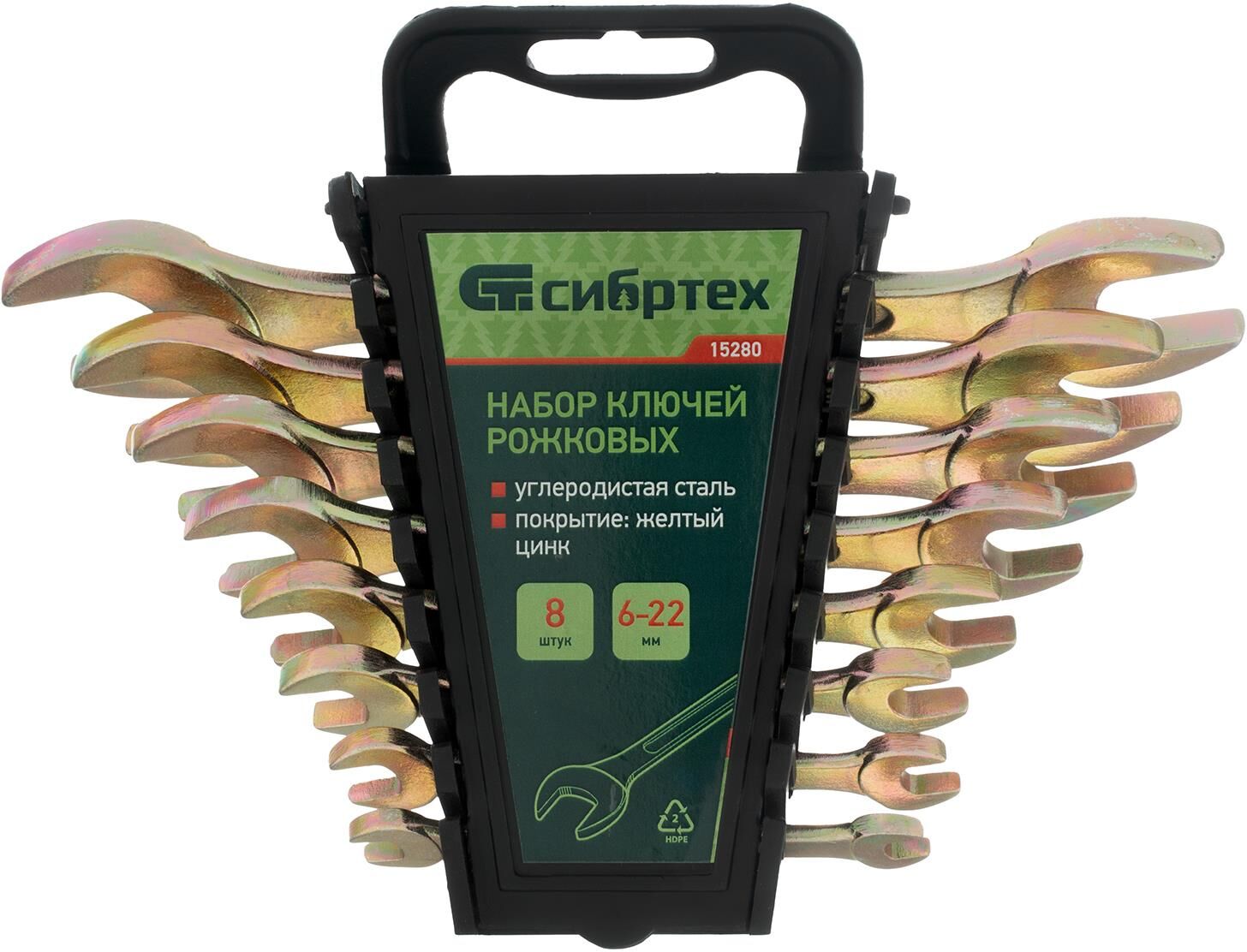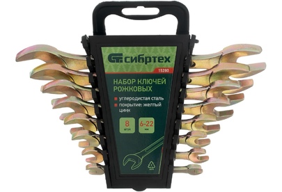 Набор рожковых ключей Сибртех 15280 размером 6-22 мм, с покрытием «желтый цинк», 8 штук в упаковке, используется для монтажа и демонтажа шестигранного резьбового крепежа соответствующего диаметра. Каждый ключ имеет две рабочие части с разным размером зева. Набор будет полезен в сервисном центре, авторемонтной мастерской, при выполнении монтажных работ. Пригодится также дома и на даче. Преимущества Прочность и устойчивость к механическим нагрузкам — ключи изготовлены из кованой углеродистой стали, прошли отжиг, закалку и последующий отпуск. Повышенная износостойкость — рабочие части закалены до необходимой твердости 46-50 HRC. Долговечность — желтое цинковое покрытие надежно защищает инструменты от образования коррозии. Продуманная упаковка — набор поставляется в пластиковом держателе, удобном для хранения и транспортировки.