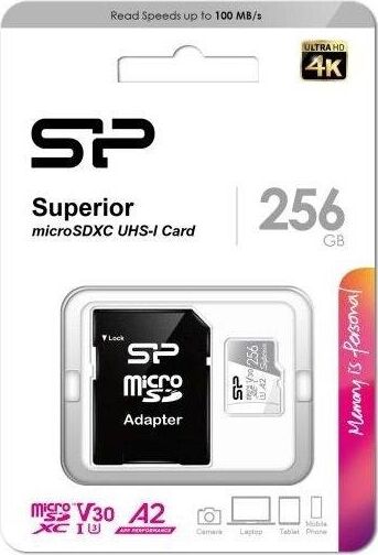 SILICON POWER Карта памяти microSDXC UHS-I U3 Superior 256 ГБ, 100 МБ/с, Class 10, SP256GBSTXDA2V20,
