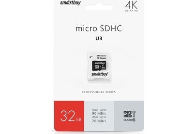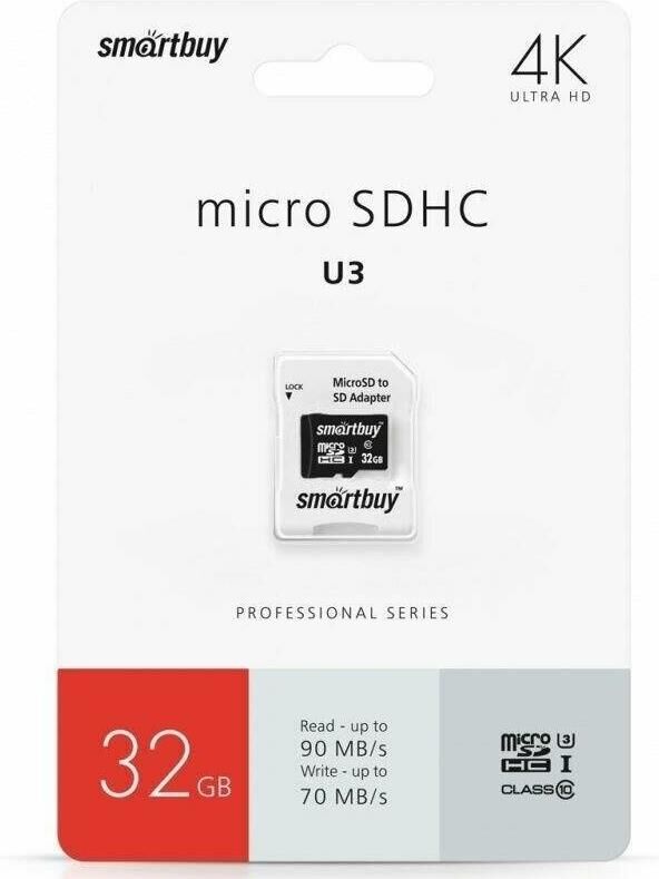 SMARTBUY (SB32GBSDCL10U3L-01) MICRO SDHC 32GB CLASS10 PRO U3 R/W: 95/60 MB/S (с адаптером SD)