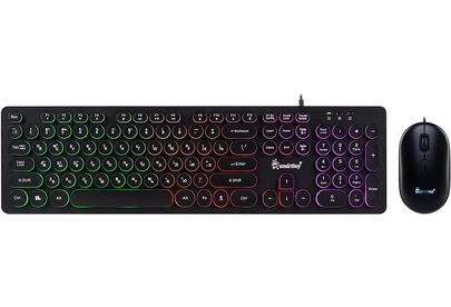 Проводной комплект, мультимедийного функционал плоские круглые клавиши + бесшумная мышь. Клавиатура имеет Rainbow-подсветку с опцией настройки яркости и функцией отключения, а также обладает повышенным ресурсом до 8 млн нажатий. Мышь полноразмерная с улучшенной эргономикой и приятной разноцветной подсветкой, есть опция отключения подсветки. Подходит для любой руки, с прорезиненным колесиком, приятным на ощупь Soft-Touch покрытием и управлением скоростью курсора от 800 до 2400 DPI., Питание USB