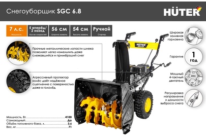 Снегоуборщик Huter SGC 6,8 предназначен для уборки от снега небольших дачных и придомовых участков, подъездных дорожек. Благодаря небольшим габаритам хорошо очищает труднодоступные места. Снегоуборщик оснащён бензиновым двигателем мощностью 7 л.с. и пятью скоростями вперёд и двумя назад. Ширина захвата при одном проходе составляет 56 см. А высота захвата составляет 54 см. Высота подъема ковша регулируется металлическими башмаками. Рабочим органом является шнек спиралевидной формы из прочной углеродистой стали, поэтому снегоуборщик способен справляться со слежавшимся снегом, настом и даже кусками льда. Загребаемый снег выбрасывается через специальный жёлоб на 15 метров в сторону. Дальность выброса регулируется посредством наклона отражателя. Поворачивать желоб можно на 190° прямо в процессе работы.