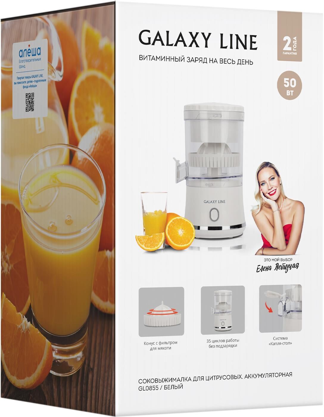 Соковыжималка аккумуляторная Galaxy LINE GL 0855, белый, для цитрусовых, 50 Вт, 250 мл, система "капля-стоп", индикатор заряда, конус с фильтром для мякоти, аккумулятор Li-ion емкостью 1500 ма*ч, напряжение батареи 3,7 В, 35 циклов работы без подзарядки, зарядка в течение 2 часов