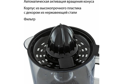 Соковыжималка для цитрусовых, Объем 0,8 л., Мощность 30 Вт., 2 сменные насадки-конуса для фруктов разного размера, Прозрачная крышка для защиты от пыли, Прорезиненные ножки, Пластиковый корпус с декором из нержавеющей стали, Легко разбирать и мыть