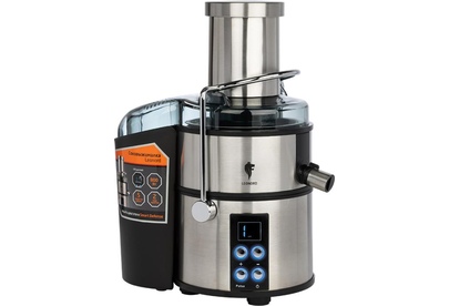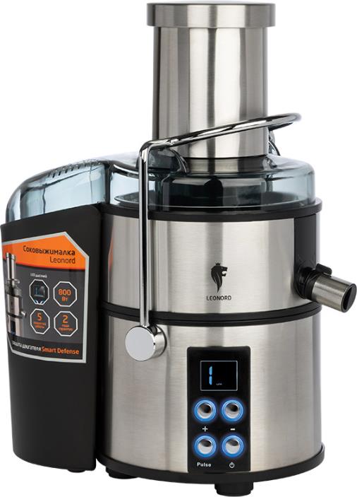 Центробежная соковыжималка Мощность 800Вт LED дисплей Электронное управление 5 скоростей Импульсный режим Скорость отжима 18 000 оборотов в минуту Автоматическая блокировка работы при неправильной сборке Система защиты двигателя от перегрузки/перегрева Smart Defense Диаметр подающей трубки 85 мм Корпус и микрофильтр из нержавеющей стали Стакан для сока 1,1л Контейнер для жмыха 2 л Прорезиненные ножки против скольжения 2 года гарантии