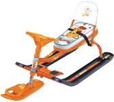 высота по спинке 450мм высота по сиденью 290мм сиденье мягкое размер сиденья 445х200мм грузоподъемность до 100кг буксировочный трос с автоматической намоткой усиленный тормоз эффективен на обледенелой поверхности складная съемная спинка комплект наклеек на снегокат в ПОДАРОК! масса 6,6кг в разобранном виде