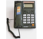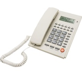 Проводной телефон с дисплеем. Сброс / Пауза/ Повторный набор. ЖК дисплей, 5 уровней контрастности. Регулировка громкости звонка. Хендс-фри, спикерфон. Переключение Импульсного /Тонового набора номера. FSKD/DTMF системы определения номера входящего звонка (Caller ID). 35 входящих, 10 исходящих номеров в памяти - номер, дата и время доступны для просмотра, 16 мелодий звонка, 10 однокнопочных набора. Календарь и часы в реальном времени на дисплее. Набор до дозвона с функцией корректировки. Функция «любимого номера». Поддержка функции Power Safe
