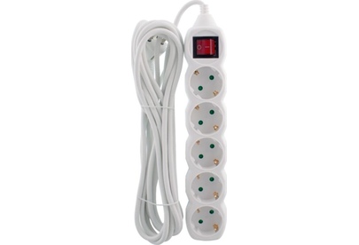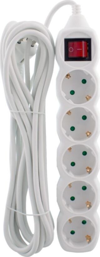 Колодка на 5 розеток Длина провода 5 м. Провод ПВС с сечением 3х0,75 мм2. Заземление Защитные шторки от детей Кнопка включения Макс нагрузка 2200 Вт Сила тока 10 А Эргономичная вилка Материал - негорючий, ударопрочный РР-пластик. Корпус неразборный. Цвет-белый