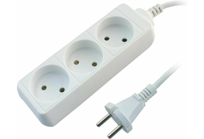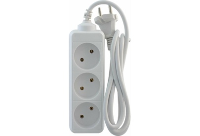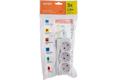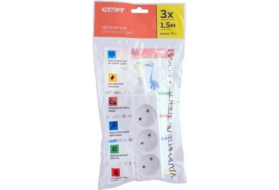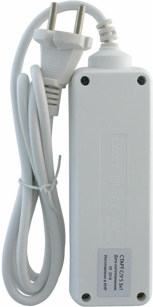 Колодка на 3 розетки Длина провода 1,5 м. Провод ПВС с сечением 3х0,75 мм2. Заземление Макс нагрузка 2200 Вт Сила тока 10 А Эргономичная вилка Материал - негорючий, ударопрочный РР-пластик. Корпус неразборный. Цвет-белый