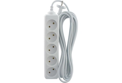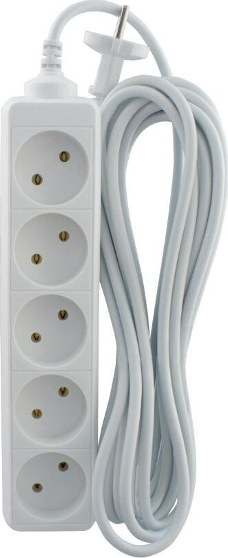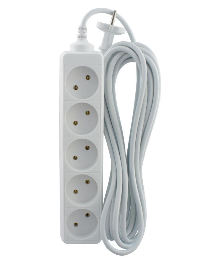 Колодка на 5 розеток. Длина провода 5 м. Провод ПВС с сечением 2х0,75 мм2. Макс нагрузка 2200 Вт Сила тока 10 А Материал - негорючий, ударопрочный РР-пластик. Корпус неразборный. Цвет-белый