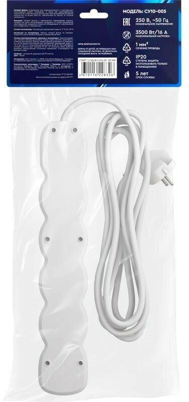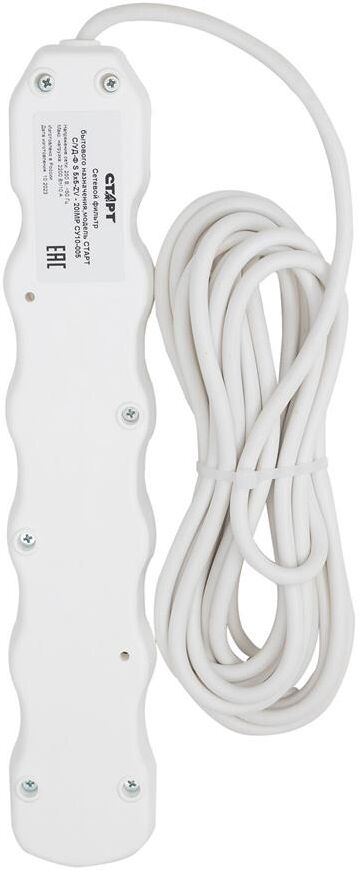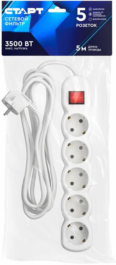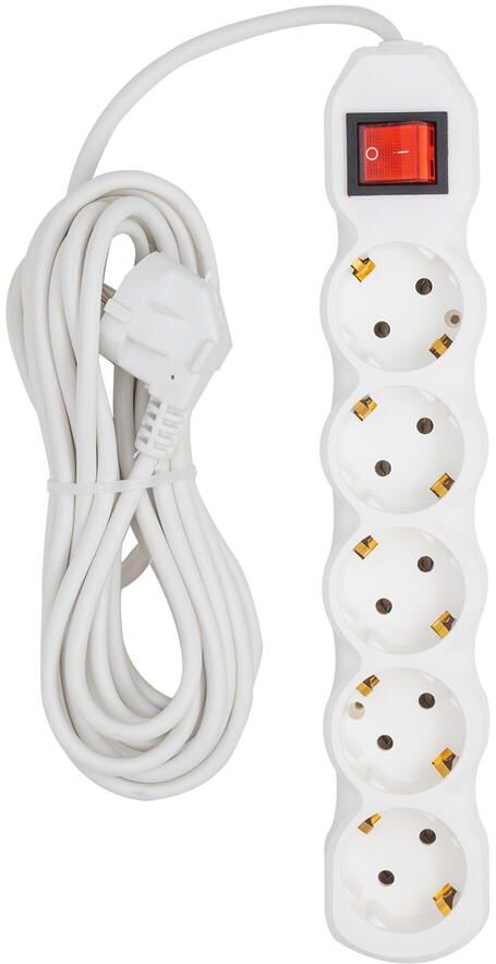 Колодка на 5 розеток Длина провода 5 м. Провод ПВС с сечением 3х0,75 мм2. Заземление Кнопка включения Макс нагрузка 2200 Вт Сила тока 10 А Эргономичная вилка Материал - негорючий, ударопрочный РР-пластик. Корпус неразборный. Цвет-белый