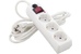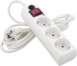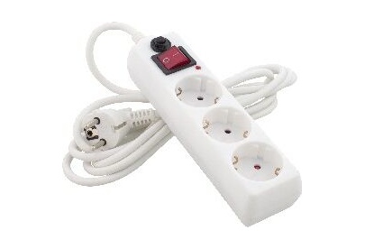 Колодка сетевого фильтра на 3 розетки. Материал колодки - негорючий РР-пластик белого цвета. С заземлением. Защита от детей. Удобная электровилка. Сила тока 10 А. Кнопка включения. Сечение провода 3х0,75 мм2. Длина провода 3,0 м.