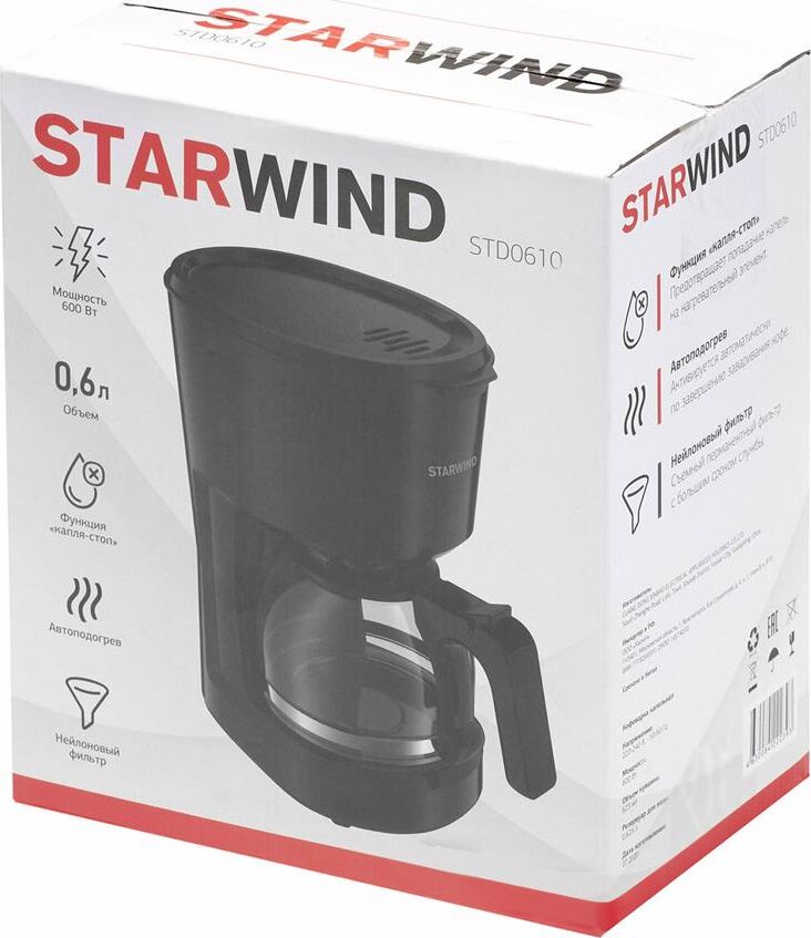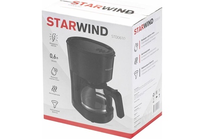 Мощность 600 Вт Резервуар для воды 0.6 л Использукемый кофе - молотый Индикатор уровня воды Противокапельная система Функция автоподогрева Материал корпуса - пластик Цвет черный Срок гарантии 12 мес
