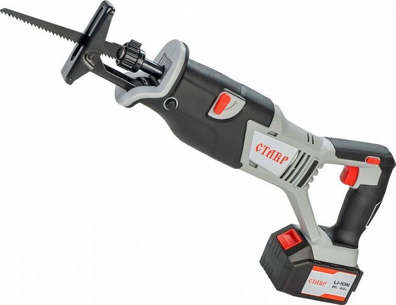 Ставр ПСА-110/20 Пила сабельная аккумуляторная Тип двигателя: щёточный Напряжение питания: 20 В Частота хода: 0-3000 ход/мин Ход пильного полотна: 20 мм Патрон: быстрозажимной Максимальная глубина пропила: дерево - 110 мм мягкие металлы - 50 мм сталь - 10 мм Масса: 1,9 кг