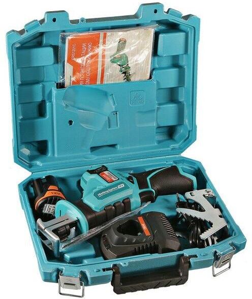 Тип: Сабельная пила. Длина хода пилы: 20. Глубина пропила (древесина): 65. Глубина пропила (металл): 65. Тип электропитания: от аккумулятора. Тип аккумулятора: Li-Ion. Емкость аккумулятора: 2. Напряжение аккумулятора: 12. Вес товара: 530. Зарядное устройство в комплекте: есть. Габариты упаковки (ед) ДхШхВ: 0.31x0.11x0.28. Вес упаковки (ед): 2.73. Комплект поставки: Пила сабельная аккумуляторная, пильное полотно по дереву, аккумуляторная батарея 2 Ач, зарядное устройство, А-образный упор (адаптер для веток), пластиковый кейс, инструкция по эксплуатации, инструкция по безопасности.. Тип электрического двигателя: щеточный. Индикатор заряда батареи: есть. Класс инструмента: бытовой. Количество аккумуляторов в комплекте: 1. Наименование аккумуляторной платформы: 1BatterySystem. Является частью аккумуляторной платформы: да. Гарантия: 14 мес.. Число ходов: 2700 ход/мин.. Размеры товара (ДхШхВ): 270х100 мм. Функциональные особенности: бесключевая замена оснастки, плавная регулировка скорости. Эргономика: А-образный у