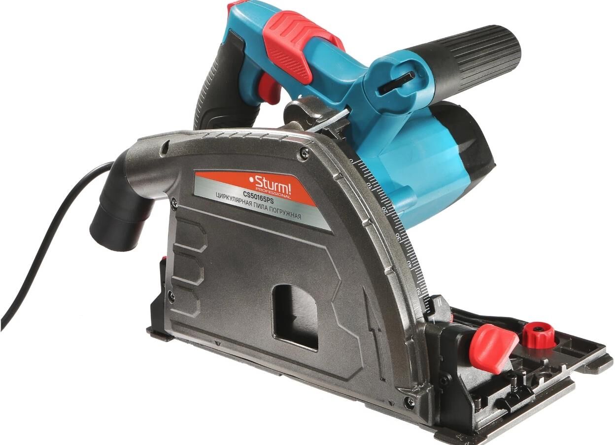 Погружная пила Sturm! CS50165PS - мощный и удобный электроинструмент для выполнения прямых пропилов, в том числе с погружением, в заготовках из дерева и пластмассы. Данная модель позволяет исполнить пропил глубиной до 56 мм под углом 90 или до 45 мм под углом 45. Пила отличается эргономичностью вспомогательной и основной рукояти с прочными резиновыми вставками. Чистота рабочей зоны сохраняется с помощью встроенного патрубка к которому возможно подключить пылесос. В пользу точности и качества резанья в наличии алюминиевая опорная подошва. Для безопасной работы инструмент оборудован защитой от непреднамеренного пуска. Морозостойкий резиновый сетевой кабель длинной 4 м способствуют комфорту при длительной работе. Особенности: - Крепление к направляющей для точных пропилов - Функция погружения позволяет выполнять внутренние пропилы - 4 м сетевой кабель - 50 м кв. рабочая зона - Литая алюминиевая платформа с дополнительными рёбрами жесткости - защита от деформаций, качественный ровный пропил Технические характерис