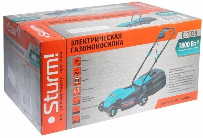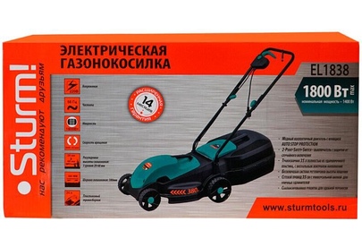 Размер колес 14/17 см. Объем травосборника (л) 35. Напряжение питания (В) 220. Вид упаковки Коробка. Масса нетто (в собранном, рабочем состоянии, но без аксессуаров) (кг) 9. Габариты в упаковке (ДхШхВ, см) 67x46x33. Максимальная мощность (Вт) 1 800. Регулировка высоты скашивания осевая. Вес инструмента в сборе без упаковки и аксессуаров (кг) 9. Срок гарантии 14 мес.. Защита от перегрева Да. Комплектация Газонокосилка, травосборник, рукоятка с набором крепежа, фиксаторы силового кабеля, инструкция по эксплуатации. Ширина скашивания (мм) 380. Номер на схеме EL1838. Высота скашивания (кол-во уровней/мм) 3/28-48-68. Тип режущего элемента нож. Травосборник (материал/л) пластик/35. Колеса передние/задние () 5,5/7. Версия 1.0. Вес 10.45 кг.