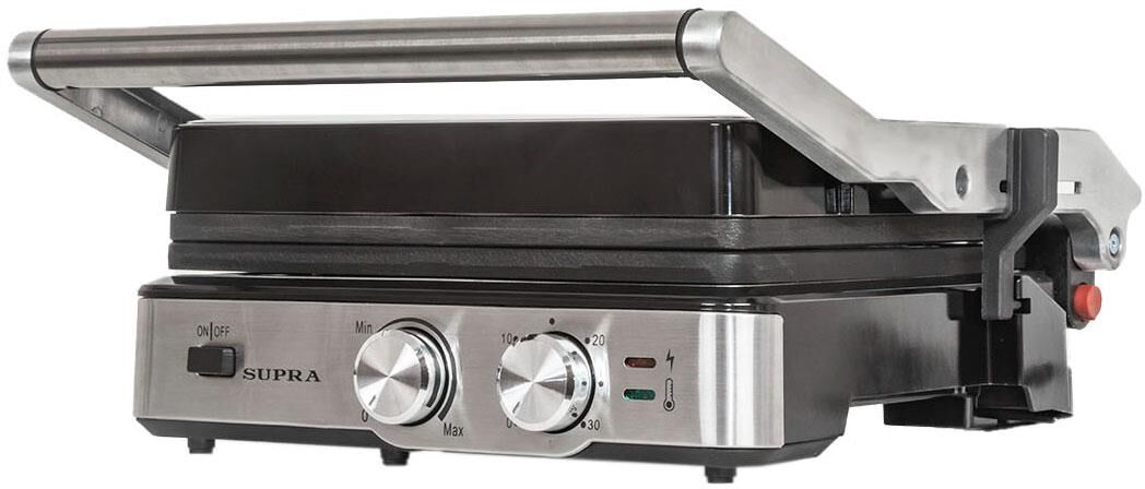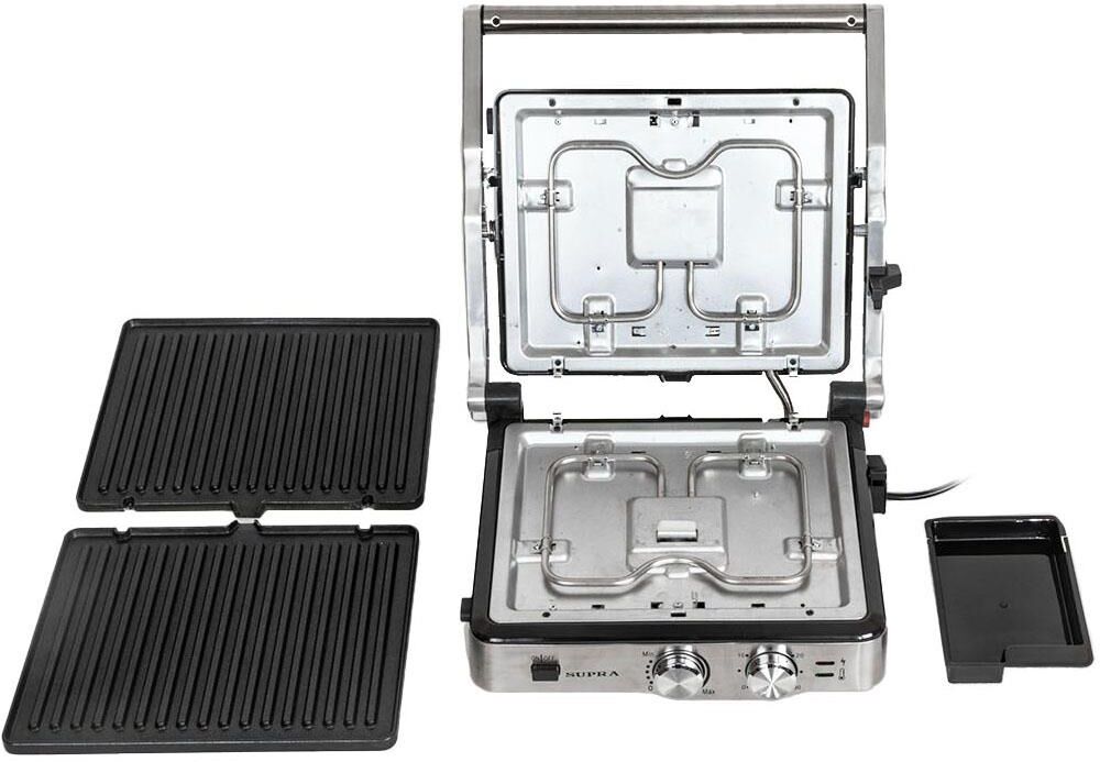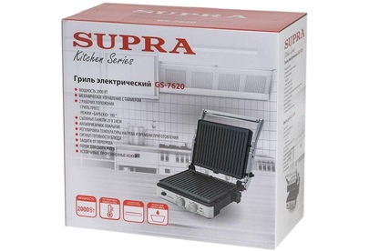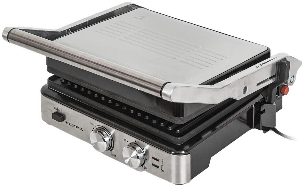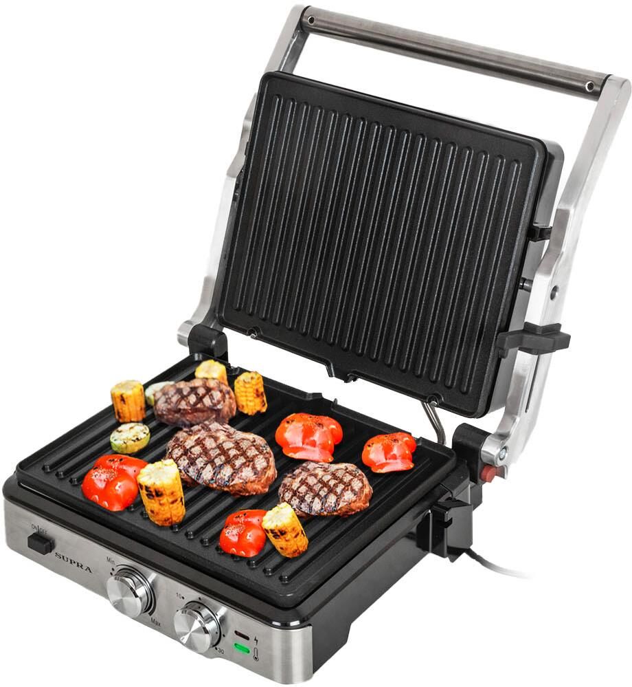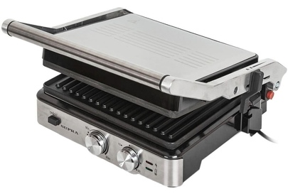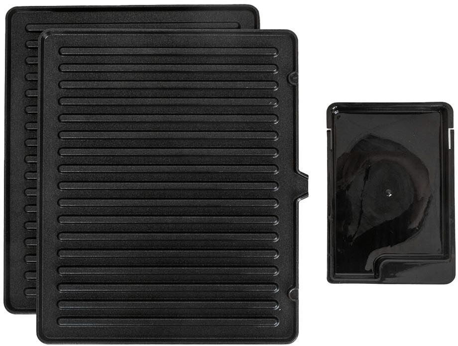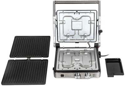 мощностью 2000 Вт, сенсорное управление, гриль-пресс, режим "барбекю" (180 градусов), съемные панели, размер панелей 29х24 см, контейнер для сбора жира