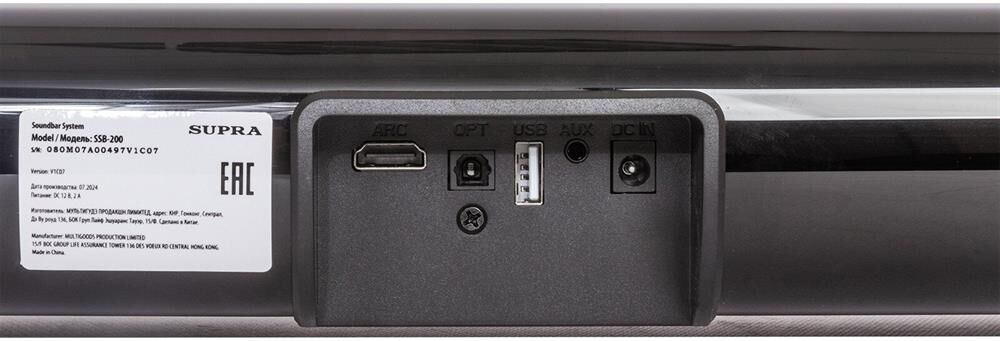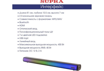 2.0-канальная звуковая панель. Совместимость с форматами: MP3/WAV. Bluetooth. HDMI. Оптический вход. Полнофункциональный пульт ДУ. 7-и цветная LED подсветка. USB порт. Линейный вход. Максимальная выходная мощность: 400 Вт. Выходная мощность RMS: 40 Вт. Питание: DC 12 В, 2 А.