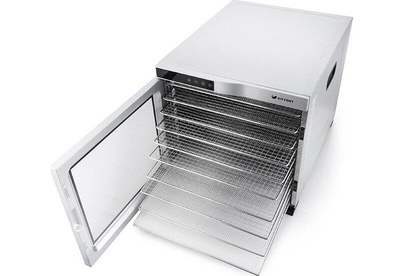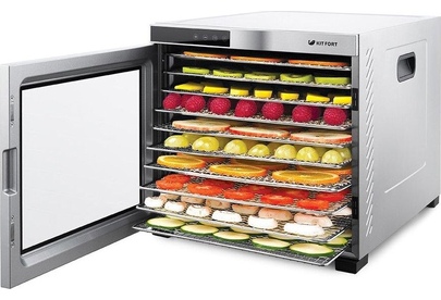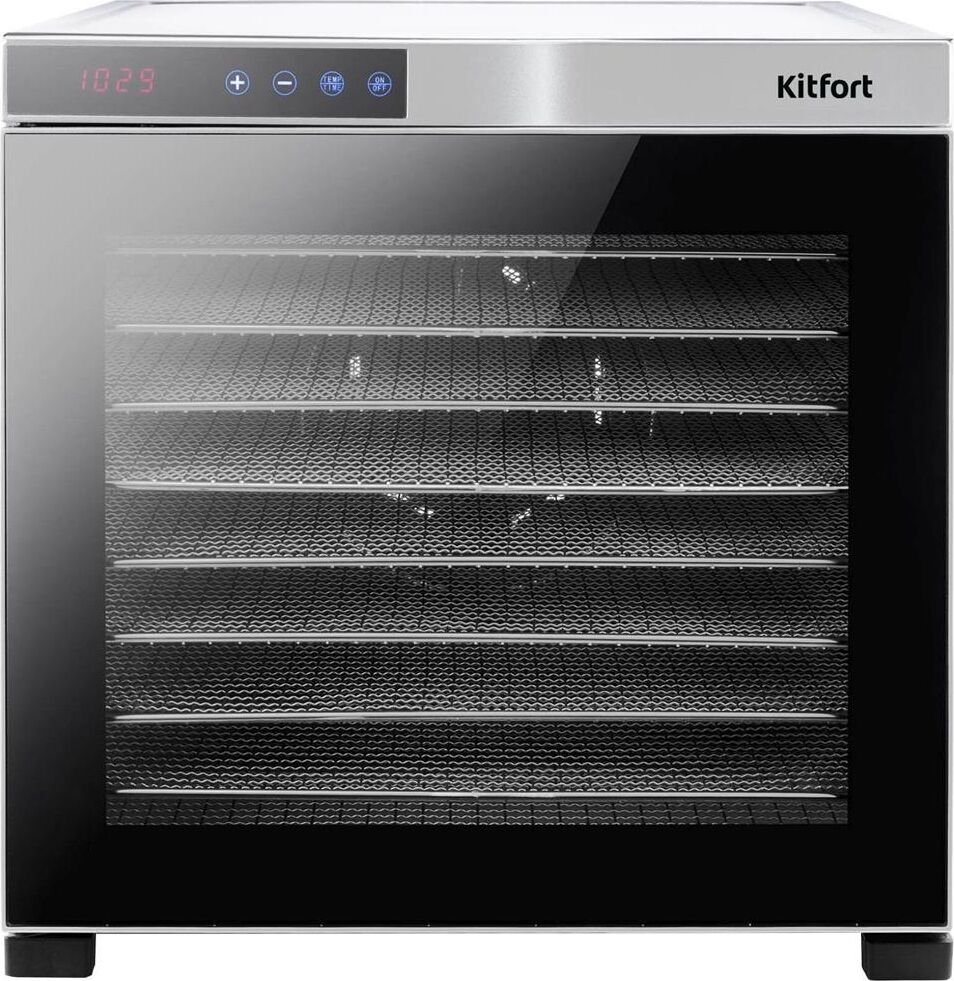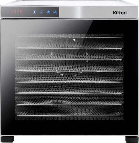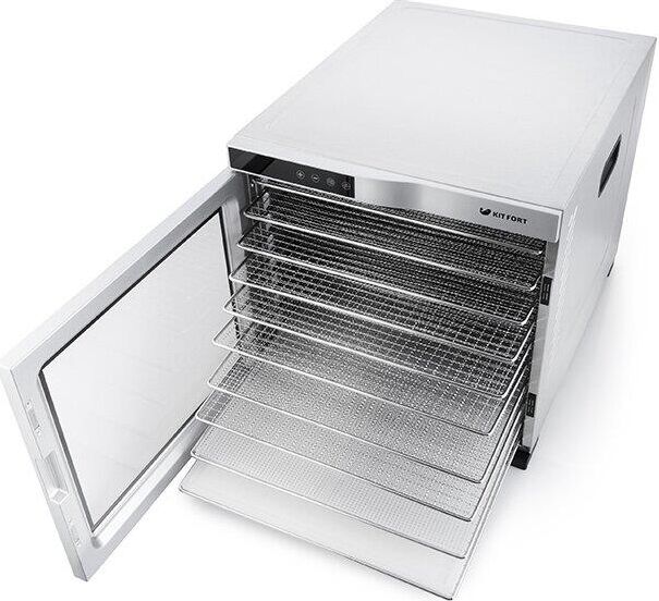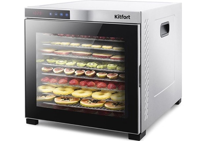 Электрическая сушилка Kitfort KT-1910 Professional Series предназначена для сушки овощей, фруктов, ягод, грибов, корнеплодов, трав и зелени, а также мяса и рыбы, хлеба. С помощью специального поддона для жидкости можно готовить пастилу. Сушилка имеет в комплекте 10 поддонов из нержавеющей стали, 1 поддон для жидкости и 1 сетку. В сушилке установлен мощный нагревательный элемент и вентилятор большого диаметра, обеспечивающий равномерное распределение нагретого воздуха по всему объему камеры. Благодаря горизонтальному обдуву смешение запахов при сушке одновременно разных продуктов минимально. На сушилке можно установить температуру сушки в диапазоне 35–75 °С с шагом 5 градусов. Сушилка оснащена таймером до 24 часов работы с шагом 30 минут.