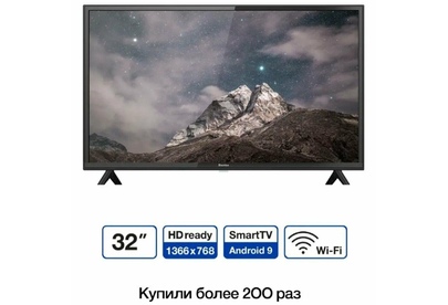 Диагональ экрана 32" (81,28 см) Разрешение 1366х768 Яркость 200 cd/m2 ±10% Контрастность 3000: 1 Операционная система Android 9.0 (AOSP) Smart TV Да Звук 2х8 Вт USB вход 2 HDMI вход 3 Компонентный вход Да Композитный AV вход Да Выход для наушников Да Выход в сеть через Ethernet Да Wi-Fi Да Габаритные размеры ШГВ (без подставки) 731 х 431 х 78 Габаритные размеры (с подставкой) 731 х 474 х 209 Вес с упаковкой 5.17 кг Вес 3.8 кг Номинальная мощность потребления 60 Вт