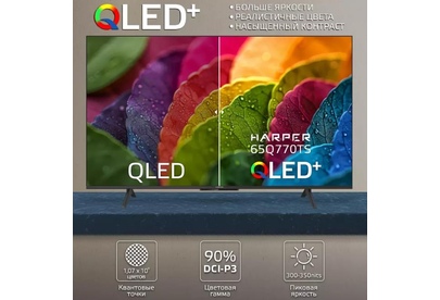 Диагональ экрана 65" (164 см); 4K QLED; Разрешение экрана 3840х2160; Смарт: Official Google Аndroid TV, Память: 2GB-RAM/16GB-ROM; Частота кадров 60-120 Гц, Dolby audio, Dolby Atmos, Аудио: 30(2х15)Вт, Голосовой помощник, Функция поиска пульта, Цифровой тюнер DVB-T/T2/C/S2; Bluetooth 5.1, Wi-Fi 2.4/5 ГГц, Безрамочный дизайн, Матовый экран без бликов и отражений, Декодеры стереозвука NICAM, А2, АСЗ; Формат изображения: 16:9; Динамический контраст 1400:1; Яркость 350 кд/м2; Угол обзора (гор/верт) 178°/178°; Цифровой 3D фильтр; Количество цветов 1 млрд.; Время отклика 8 мс; Меню на русском, английском языках; Телетекст; Входы/выходы: Антенный вход, Вход для спутниковой антенны, Композитный видео/аудио вход, 3х HDMI (1.4/2.0), 2 х USB (2.0), S/PDIF (Оптический), LAN, CI слот. Размеры с подставкой: 1445х913х301 мм; Размеры без подставки: 1445х838х91,5 мм ; Вес: 14,1кг; VESA: 400х200; Габариты в упаковке: 1620x965x155 мм; Вес в упаковке: 23,8кг