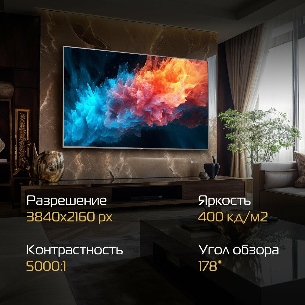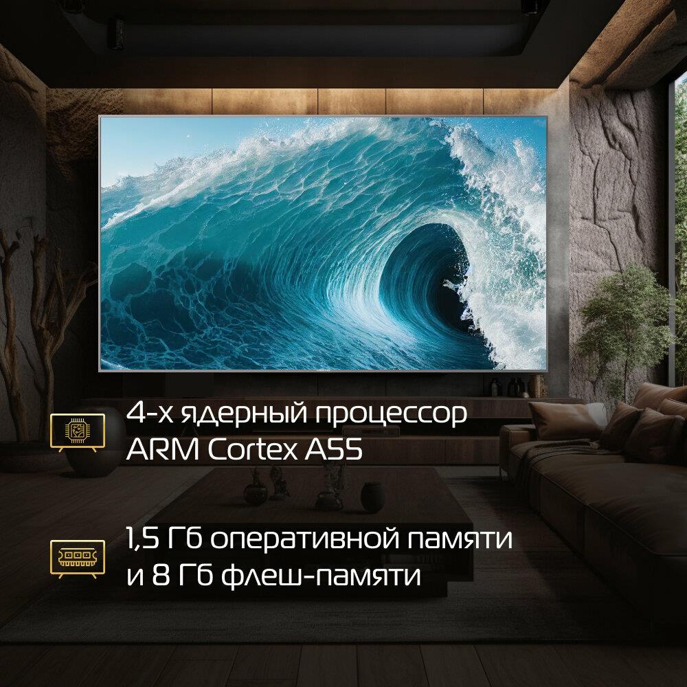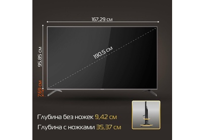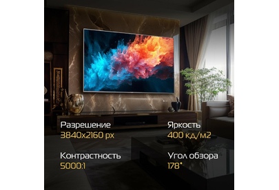 Тип Smart-телевизор. Диагональ 75 дюймов. Диагональ 190.5 см. Технология экрана QLED. Технология HDR есть. Максимальное разрешение в формате Ultra HD 4K 3840x2160 p. Матрица VA. Рамка Метал. TV - тюнер DVB-T/T2/C/S2. Вход сбоку 2*RF, 2*USB, 1*Cl. Вход сверху 1*LAN, 3*HDMI, 1 mini AV, 1*OPTICAL, 1*EARPHONE. Smart Yandex TV. Процессор CPU Cortex A53*4 64bit @1.5 гГц. Процессор GPU G52 (2EE)MC1. RAM 1,5 гБ. ROM 8 гБ. WiFi есть. Яркость 400 д/м2. Контрастность 5000:1. Угол обзора 178 ?. HDR есть. Мощность динамиков 2 х 10 Вт. Динамики Интегрированные. Аудио-система Баланс, Dolby/Dolby+, Surround. Другие функции Multiscreen (Miracast), Обновление ПО Автоматическое, Таймер сна, Родительский контроль, Цветовая температура (Теплый/Холодный/Стандартный/Пользовательский), ARC, CEC. Крепление VESA 400 х 200 /M8 мм . Диапазон номинальных напряжений 220-240 Вт. Номинальная чистота 50/60 Гц. Класс энергоэффективности А.