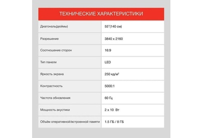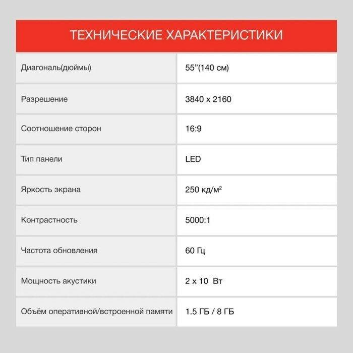 Технология экрана LED, Поддержка SMART TV, ОС Яндекс.ТВ Разрешение4K Ultra HD Покрытие экрана глянцевое Соотношение сторон 16:9 Яркость экрана 250 кд/м2 Контрастность 5.000:1 Время отклика пикселя 6.5 мс Углы обзора (гориз / верт) 178x178 Частота обновления 60 Гц Встроенный Wi-Fi да Встроенный Bluetooth да Телетекст ДА Таймер сна ДА Таймер включения / выключени яДА Родительский контроль ДА Функция Time Shift ДА