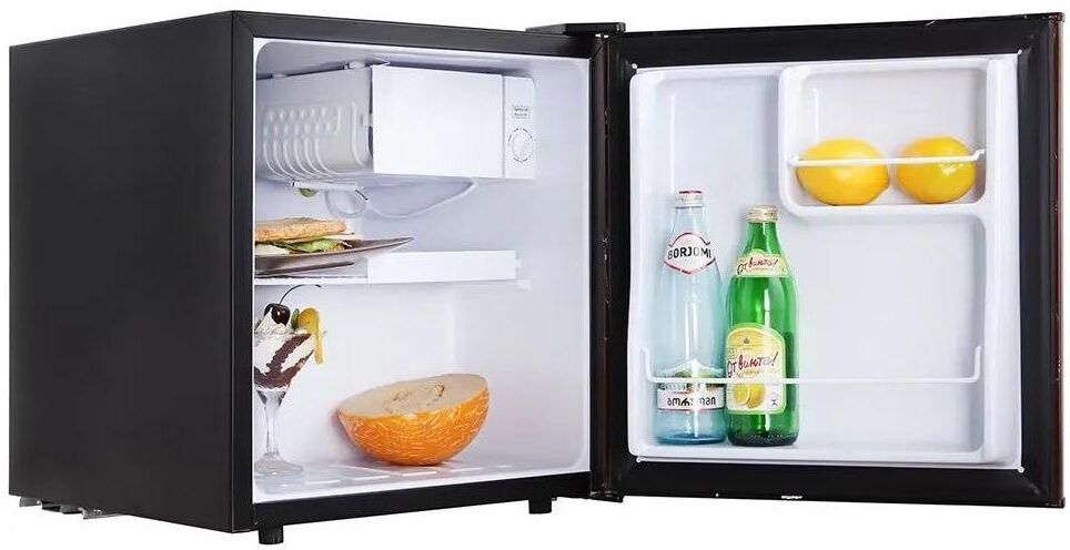 Количество камер: однокамерный. Тип управления: механическое. Класс энергопотребления: A. Система размораживания: ручное. Общий объем холодильника: 50. Общий объем холодильной камеры: 45. Уровень шума: 39. Количество компрессоров: один. Хранение при отключении питания: 10. Количество полок: 1. Материал полок: металлическая решетка. Тип: Холодильник. Общий объем дополнительных камер: 5. Хладагент: R600a. Вес (нетто): 14. Количество дверей: 1. Особенности дополнительных камер: Объем отделения с пониженной температурой.. Тип компрессора: стандартный. Габариты упаковки (ед) ДхШхВ: 0.511x0.47x0.53. Вес упаковки (ед): 28. Количество полок на дверце: 2. Материал дверей: металл. Наличие морозильной камеры: морозильная камера отсутствует. Температура холодильной камеры max: 10. Направление открывания двери: вправо. Гарантия: 12 мес.. Цвет: коричневый/черный. Потребление энергии: 135.78 кВт*ч/год. Размеры (ШхВхГ): 44.5 х 49 х 46.5 см. Особенности конструкции: перевешиваемые двери, регулируемые по высоте ножки. Климатич
