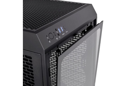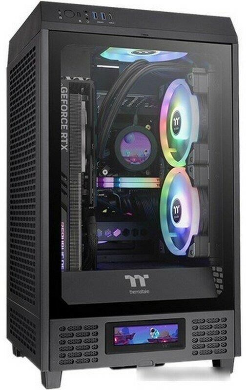 Корпус Thermaltake The Tower 200 черного цвета имеет оригинальный дизайн и компактные размеры. Его конструкция предполагает сборку производительного игрового ПК. На стальном корпусе есть перфорация для улучшения вентиляции всех элементов ПК. Лицевая панель из закаленного стекла позволяет увидеть внутреннее оформление ПК с RGB-подсветкой. В корпусе есть место для видеокарты длиной до 380 мм. Чтобы исключить ее подвижность, используется специальный стабилизатор.