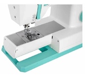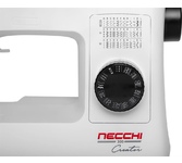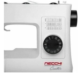 Швейная машина Necchi Q134A использует иглы типа 130 и 705 Н на горизонтальном пластиково-металлическом челноке. Способна производить три вида строчек (оверлочных - шесть, потайных - шесть, декоративных - 15) и 34 швейные операции. Тип выполняемой петли - автомат. Максимальная ширина зигзага составляет 6 мм при скорости шитья до 700 стеж/мин. Устройство располагает четырьмя лапками (для молний, петли-полуавтомат, пришивания пуговиц, стандартная) с максимальной высотой подъема 7 мм. В комплекте три пластиковые шпульки, наматывание на нитку происходит с использованием электромеханической функции. Присутствует съемная рукавная платформа. Регулировать возможно длину стежка, давление лапки, скорость шитья, ширину зигзага, натяжение нити. Встроен реверс. Тип освещения рабочей зоны - LED. Пластиковый бирюзовый корпус размещает катушку в горизонтальной плоскости, отсек для аксессуаров, механизм вдевания нити, ручку для переноски, прорезиненные ножки педали. Швейная машина Necchi Q134A способна выполнить до 34 видов с