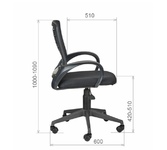 Крестовина: «Паук»600 мм.Подлокотники: пластик.Обивочные материалы: ткань серии «TW».Газпатрон: стандартный,Механизм: Топ-Ган (мезханизм качания с регулировкой жесткости и фиксацией в рабочем положении)/ Опора-пиастра.Ролик: пластик,Размеры: В 1000-1110 Ш 480 Г 510