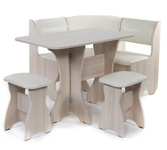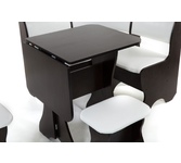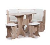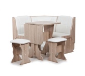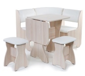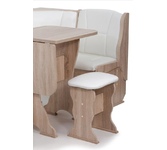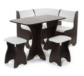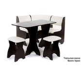 Набор мебели для кухни включающий в себя угловую скамью, стол и два табурета.В угловой скамье под сиденьями расположены два ящика .Каркас ЛДСП.Покрытие верхней части столешницы стола - термостойкий пластик, кромка ПВХ -1мм. Угловая скамья собирается как в правом ("Г"), так и в левом исполнении ("7"). В целях безопасности и придания лучшего эстетического вида углы столешницы закруглены Размер угловой скамьи по длине 1500х1100 или 1100х1500 в зависимости от сборки ( "Г" или "7"), высота угловой скамьи 840, глубина угловой скамьи 530.Размер столешницы стола 1000х580, высота стола 750. Размер сденья табуерта 300х380, высота табурета 450.