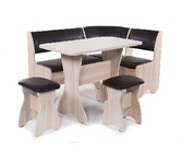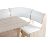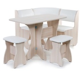 Описание: Набор мебели для кухни включающий в себя угловую скамью, стол и два табурета.В угловой скамье под сиденьями расположены два ящика .Каркас ЛДСП.Покрытие верхней части столешницы стола - термостойкий пластик.Угловая скамья собирается как в правом