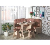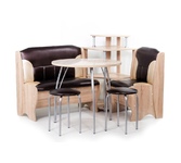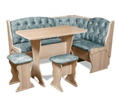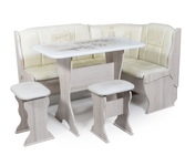 Набор мебели для кухни включающий в себя угловую скамью, стол и два табурета. В угловой скамье под сиденьями расположены два ящика. Каркас ЛДСП. Покрытие верхней части столешницы стола - термостойкий пластик, кромка ПВХ -1мм. Угловая скамья собирается как в правом ("Г"), так и в левом исполнении ("7"). Углы столешницы закруглены для избежания травмирования и придания лучшего эстетического вида. Размер угловой скамьи по длине 1500х1100 или 1100х1500 в зависимости от сборки ( "Г" или "7"), высота угловой скамьи 840, глубина угловой скамьи 530. Размер столешницы стола 1000х580, высота стола 750. Размер сиденья табуерта 300х380, высота табурета 450.