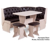 Набор мебели для кухни с классической красивой каретной стяжкой, включающий в себя угловую скамью, стол и два табурета.В угловой скамье под сиденьями расположены два ящика .Каркас ЛДСП.Покрытие верхней части столешницы стола - термостойкий пластик, кромка ПВХ -1мм. Угловая скамья собирается как в правом ("Г"), так и в левом исполнении ("7"). Углы столешницы закруглены для избежания травмирования и придания лучшего эстетического вида.Каракс выолнен из ЛДСП - Декор Ясень , Обивка мягких частей выполнена из мягкой экокожи -Барное Умбер ( Темный шоколад)) с каретной классической стяжкой. Размер угловой скамьи по длине 1500х1100 или 1100х1500 в зависимости от сборки ( "Г" или "7"), высота угловой скамьи 840, глубина угловой скамьи 530.Размер столешницы стола 1000х580, высота стола 750. Размер сденья табуерта 300х380, высота табурета 450.