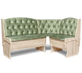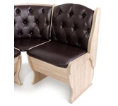 Описание: Набор мебели для кухни с классической красивой каретной стяжкой, включающий в себя угловую скамью, стол и два табурета. В угловой скамье под сиденьями расположены два ящика. Каркас ЛДСП. Покрытие верхней части столешницы стола - термостойкий пла