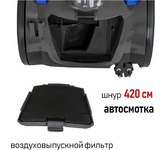 Мощность 2400 Вт, мощность всасывания 420 Вт, Тип пылесборника: циклонный фильтр 2,5 литра, 5-ти ступенчатая система фильтрации, металлическая телескопическая трубка, 1 год гарантии, длина сетевого шнура 5 м, индикатор заполнения, регулятор мощности. Цвет синий.