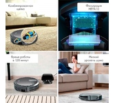 Мощность: 70. Объем пылесборника: 0.4. Регулировка мощности: в приложении. Общее количество насадок: 1. Вес товара: 2.8. Бак для чистой воды: 0.25. Другие насадки и принадлежности: сменный фильтр HEPA. Особенности: Дополнительные 13 датчиков сближения, касания и перепада высот помогают R70 лучше ориентироваться в помещении и быть аккуратным с элементами интерьера.. Тип электропитания: от аккумулятора. Тип аккумулятора: Li-Ion. Емкость аккумулятора: 2000. Уровень шума: 65. Вес базы: 2.2. Пульт ДУ: есть. Тип ограничителей движения: инфракрасные. Габариты упаковки (ед) ДхШхВ: 0.53x0.126x0.4. Вес упаковки (ед): 4.5. Страна производства: Китай. Зарядка робота-пылесоса: док-станция. Мощность всасывания (Па): 2200. Количество боковых щеток: 2. Количество основных щеток: 1. Высота преодоления порога: 1.5. Форма робота-пылесоса: круглый. Гарантия: 12 мес.. Время уборки: 60 - 120 минут. Время заряда: 180 - 240 минут. Размеры (ШхВхД): 335 х 335 х 78 мм. Цвет: серый/серый. Режимы движения робота-пылесоса: вдоль стены, по