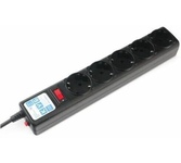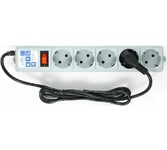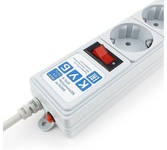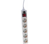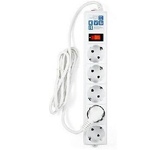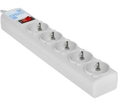 защита от импульсн помех, короткого замык и перегрузок, 220В, макс ток нагрузки 10А, макс поглощ энергия 90Дж, кабель ПВС-ВП 3х0.75мм2, Выключ – со светодиод индикац и коммутац двух проводников (фазы и нуля), 5 заземл евро-розеток, корпус – негорючий плас