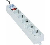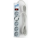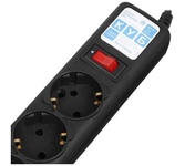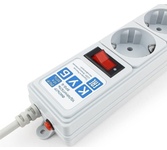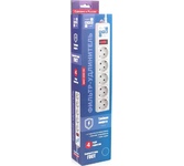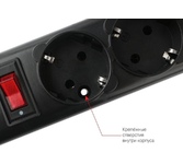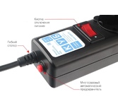 защита от импульсн помех, короткого замык и перегрузок, 220В, макс ток нагрузки 10А, макс поглощ энергия 90Дж, кабель ПВС-ВП 3х0.75мм2, Выключ – со светодиод индикац и коммутац двух проводников (фазы и нуля), 5 заземл евро-розеток, корпус – негорючий плас