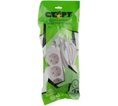 СТАРТ С/У S 3x1-Z Сетевой удлинитель для одновременного подключения 3-х бытовых устройств с суммарной мощностью до 2200 Вт. Форма удлинителя – классическая, гнезда в один ряд. Дизайн корпуса современный, выполнен в форме «матрешки». Длина кабеля данной модели – 1,5 метра. Сетевой удлинитель предназначен для локального подключения стационарных устройств: домашнего компьютера, детской музыкальной аппаратуры, подзарядки строительных инструментов. Вилка оснащена упорным кольцом для комфортного отключения удлинителя из розетки. Корпус и вилка сетевого удлинителя выполнены из негорючего поликарбоната с высокими ударопрочными характеристиками. Удлинитель укомплектован заземлением для защиты от электроприборов с металлическим корпусом. Контакты разъемов и заземления выполнены из латуни, что увеличивает их долговечность. Подключение электроустройств мощность, которых превышает 2200 Вт не рекомендуется, во избежание пожароопасных ситуаций.