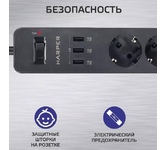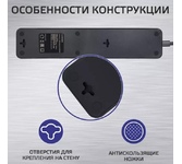 Сетевой фильтр с 2xUSB+1xType-C портами; Розетки 5 шт.; Длина кабеля 2 метра; Цвет черный; Максимальная мощность 4000W (16A); 2xUSB, 1xType-C (Максимальная суммарная сила тока: 3 А), поддержка QC/PD; Защитные шторки, Защита от перегрузки и короткого замыкания; Стильный лаконичный дизайн; Огнеупорный пластик; Питание AC 220-250V 50Hz.