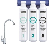Фильтр Expert Complex, комплексная очистка городской водопроводной воды, три ступени очистки, 1-я ступень Ферростоп, 2-я ступень Смягчение, 3-я ступень Посткарбон, защита от крупных механических частиц, активного хлора, ионов тяжелых и токсических металлов, очистка воды от ржавчины, устранение неприятных запахов и привкуса воды, эффективно снижает жесткость и очищает от железа, скорость фильтрации 2 литра в минуту, срок службы фильтроэлементов до 1 года, установка и замена картриджей в 1 касание, технология Smart Lock фиксация картриджей и гарантия от протечек, температура очищаемой воды +5 до +35 градусов, максимальное рабочее давление 7 атм, ресурс комплекта 10 000 литров, кран для чистой воды в комплекте.