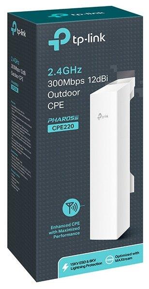 TP-LINK CPE220 2.4GHZ 300MBPS 12DBI OUTDOOR CPE, 12DBI 2X2 DUAL-POLARIZED DIRECTIONAL MIMO ANTENNA, 13+ KM, 2 FE PORTS, 15KV ESD PROTECTION, 6KV LIGHTNING PROTECTION, IPX5, WEATHER PROOF ENCLOSURE, AP/CLIENT/AP ROUTER/WISP MODE, CMS – PHAROS CONTRO Стандарт Wi-Fi: WiFi 4 (802.11n) Диапазоны Wi-Fi: 2.4 ГГц Установка: На мачту, Уличная