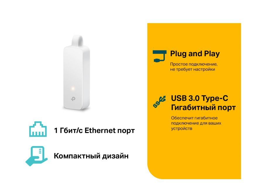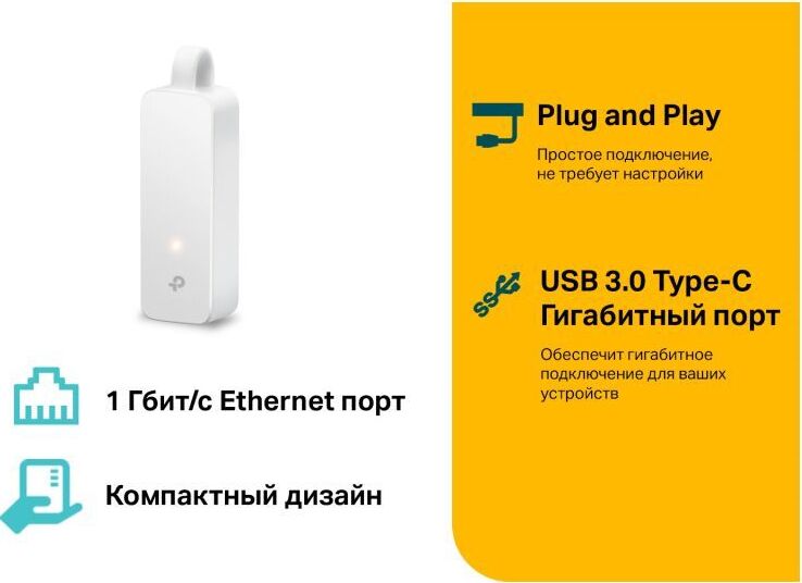 Сетевой адаптер USB Type C/Gigabit Ethernet TP-LINK UE300C Отличное решение для подключения ноутбуков, планшетов и других устройств с разъёмом USB Type-C к проводной сети. Высокоскоростное решение USB 3.0/Gigabit Ethernet обеспечивает передачу данных со скоростью до 1 Гбит/с. Поддержка Plug and Play для Windows 10, Mac OS X (10.9 и новее), Chrome OS и Linux OS. Складной портативный дизайн идеально подходит для ноутбуков типа Ultrabook Интернет-подключение по кабелю для устройств USB-C Создайте мгновенный скоростной доступ к проводной сети для ноутбука, планшета, компьютера и других устройств с разъёмом USB Type-C. Гигабитное подключение UE300C оборудован портами USB 3.0 и Gigabit Ethernet, а также поддерживает скорость передачи данных до 1 Гбит/с, благодаря чему он идеально справляется с передачей больших файлов, стримами, онлайн-играми и не только. Складной портативный корпус Вес: 20 г Размеры: 71 ? 26 ? 16,2 мм Характеристики Тип: Сетевой адаптер Интерфейс: USB Type C Скорость: 10/10