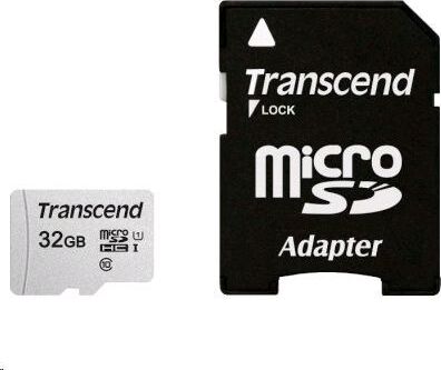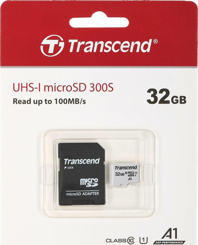 TRANSCEND 32 ГБ, 95 МБ/с, Class 10, TS32GUSD300S-A, переходник SD